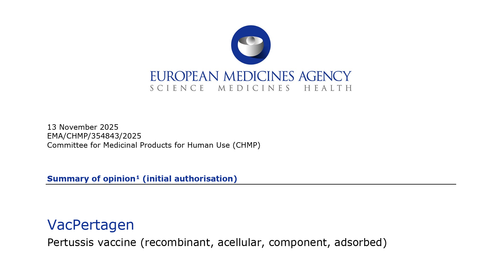 Lyon, November 18, 2025: BioNet, a biotechnology company focused on next-generation vaccines, today announced that the Committee for Medicinal Products for Human Use (CHMP) of the European Medicines Agency (EMA) has adopted a positive opinion recommending the granting of a marketing authorisation in the European Union for VacPertagen, a standalone acellular pertussis vaccine.